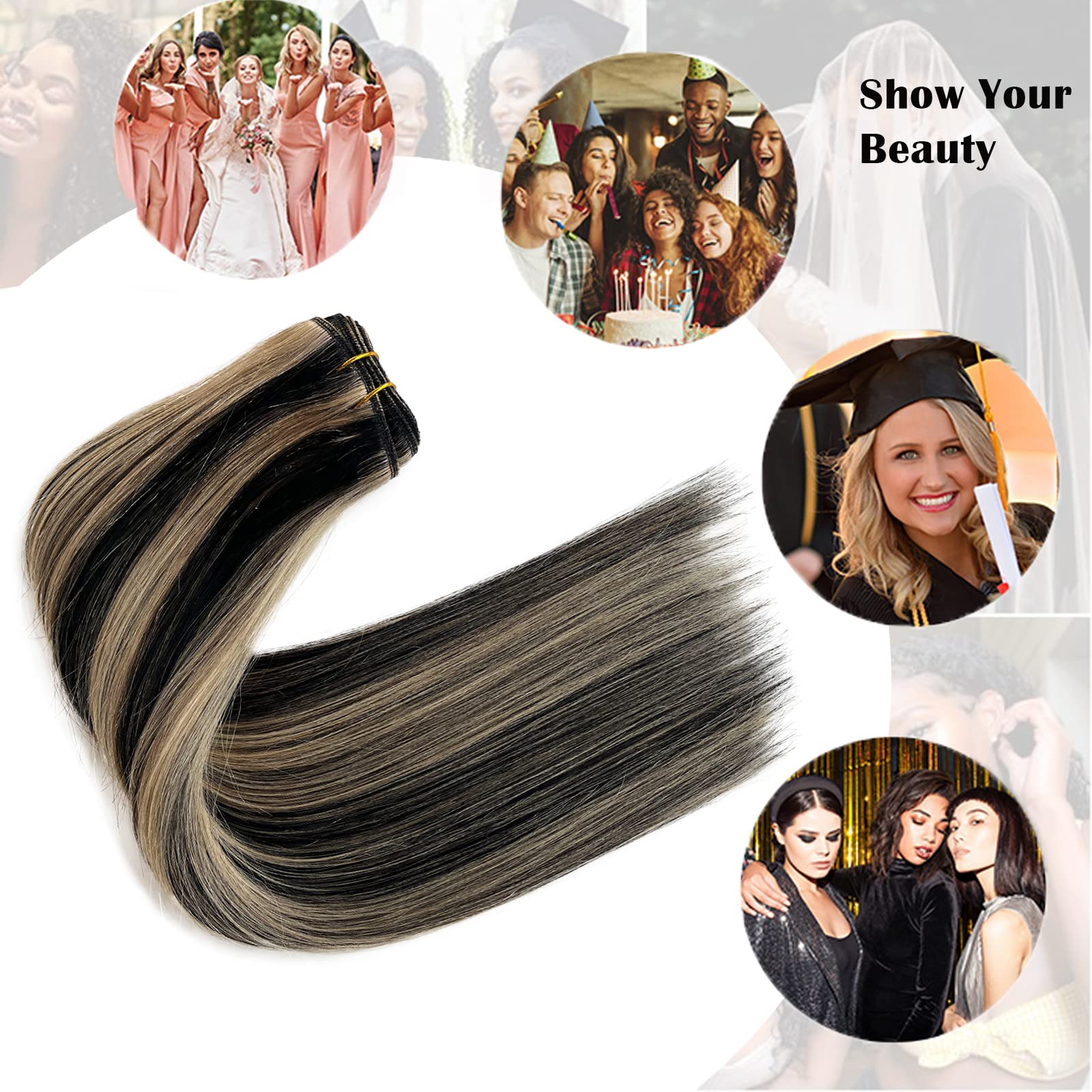 Amazon Com Sew In Hair Weft Bundles 16 Inch 100g Straight Weave Hair Bundles Remy Hair Double Weft Hair Extensions Highlighted Color Black With Bleach Blonde For Women Brazilian Remy Human Hair